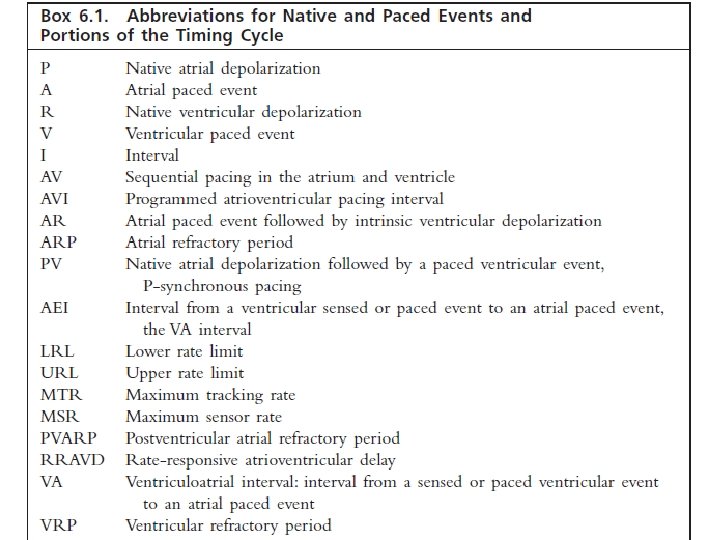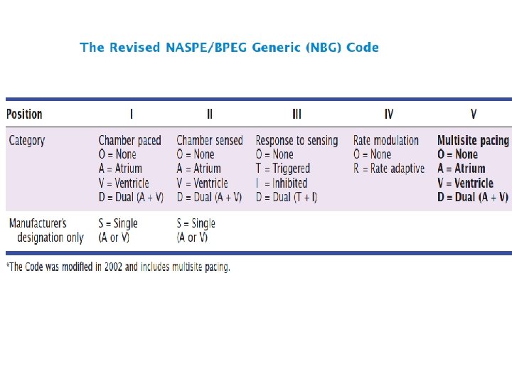 NASPE/ BPEG Generic (NBG) Pacemaker Code I Chamber Paced II Chamber Sensed III Response to Sensing IV Programmable Functions/Rate Modulation V: Ventricle T: Triggered P: Simple programmable A: Atrium I: Inhibited M: Multiprogrammable D: Dual (A+V) D: Dual (T+I) C: Communicating O: None S: Single (A or V) O: None V Antitachy Function(s) P: Pace S: Shock D: Dual (P+S) R: Rate modulating O: None