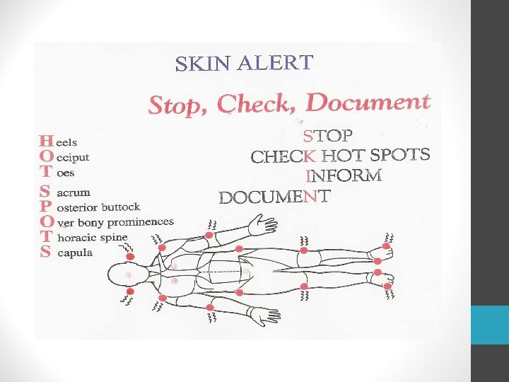 Bony Prominences • Pressure ulcers can form over any bony prominence or any area of soft tissue that is subjected to prolonged pressure • Sacrum • Coccyx • Ischial tuberosities • Greater trochanters • Elbows • Heels • Scapulae • Occipital bone • Sternum • Ribs • Iliac crests • Patellae • Lateral malleoli • Medial malleoli