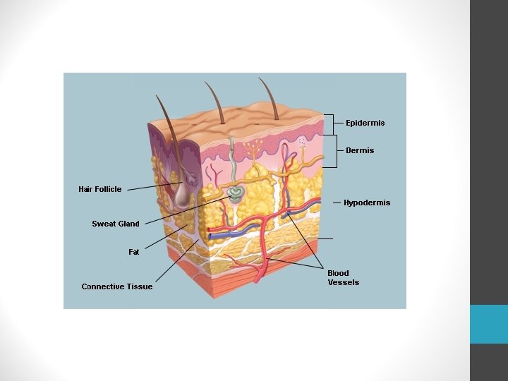 Skin Characteristics and Functions • Skin thickness ranges from 1/50 of an inch over the eyelids to 1/3 of an inch on the palms of the hands and the soles of the feet • Specialized skin cells harden to form nails and elongate to form hair • The p. H of skin normally ranges from 4. 5 to 5. 5, thus providing the protective mantle of the skin, which serves to maintain the skin’s normal flora