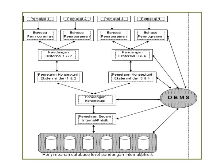 ARSITEKTUR BASIS DATA External Level atau View Level • Level Eksternal adalah level yang berhubungan langsung dengan pengguna database. • Pada level ini pengguna (user) hanya bisa melihat struktur data sesuai dengan keperluannya sehingga setiap user bisa memiliki pandangan (view) yang berbeda dari user lainnya. • Pada level ini pula dimungkinkan pandangan user berbeda dengan representasi fisik dari data, misalkan untuk data hari secara fisik data direkam dalam bentuk kode (1, 2, 3, dst) sedang user melihat data dalam bentuk teks nama hari (Ahad, Senin, Selasa, …). • Data yang dilihat oleh user seakan-akan berasal dari satu file, secara fisik mungkin diambil dari beberapa file yang berelasi.