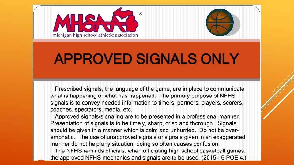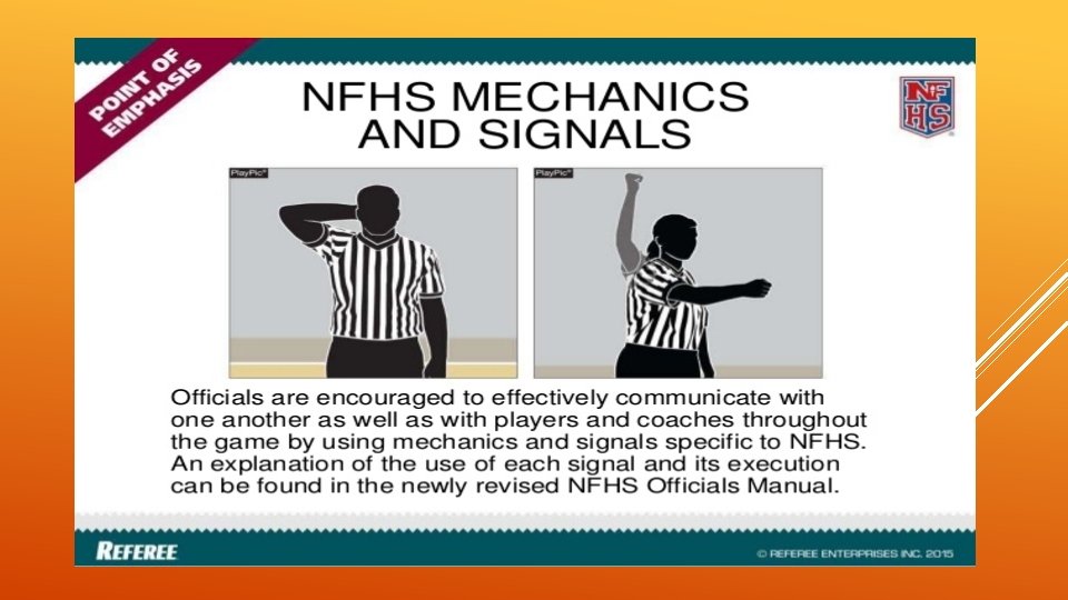 APPROVED “SIGNALS” ONLY - THE ONLY SIGNALS THAT ARE TO BE USED ARE THOSE FOUND IN THE CURRENT NFHS RULE BOOK, CASE BOOK AND OFFICIALS MANUAL. NEVER MAKE UP YOUR OWN SIGNALS! OFFICIALS MUST UNDERSTAND ONLY USE THE APPROVED MECHANICS. PROPER COURT COVERAGE REQUIRES A SYSTEM OF GOOD MECHANICS TO ENSURE OFFICIALS WILL BE AT THE PROPER PLACE ON THE COURT AT ALL TIMES.