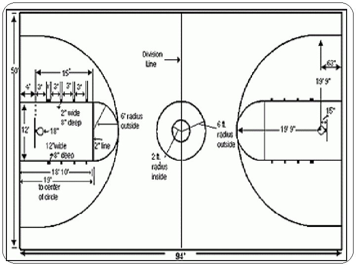 Basic Rules of Basketball �Two teams each have five players on the court at one time �Each team tries to score by shooting the basketball through the hoop �The basketball is 29 inches around. This size is modified for younger players and girls competition. �The hoop is an 18 inch cylinder attached to the backboard and positioned 10 feet off the ground. The height of the hoop is modified for younger players.