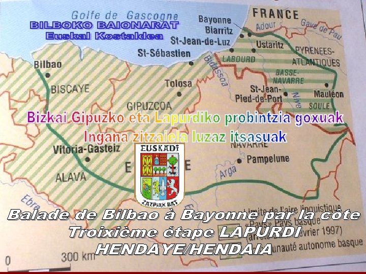 Le blason d'Hendaye date de 1660, il représente une baleine avec 3 harpons, rappelant les marins hendayais pêcheurs de baleines et une couronne royale, souvenir du passage de Louis XIV sur le territoire d'Hendaye. Armoierie et Bateau Bixintxo 1949