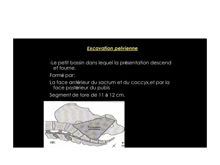 Excavation pelvienne • C’est la région anatomique du bassin dans laquelle la présentation effectue sa descente et sa rotation; comprise entre le DS et le détroit inférieur.