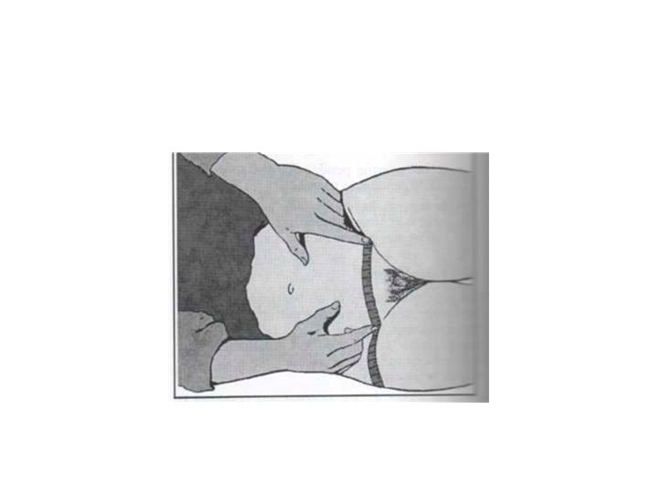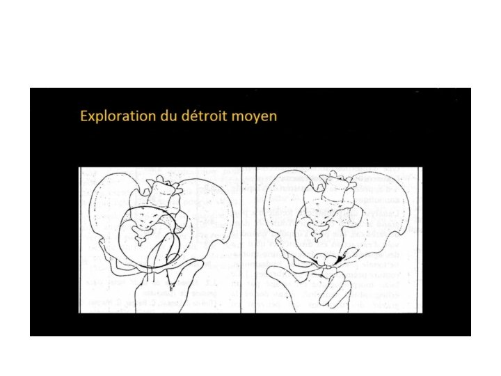 Pelvimétrie interne • La patiente doit être installée sur un plan dur, en position gynécologique, vessie et rectum vides. La main et l’avant-bras de l’examinateur doivent rester dans le même axe que le bassin