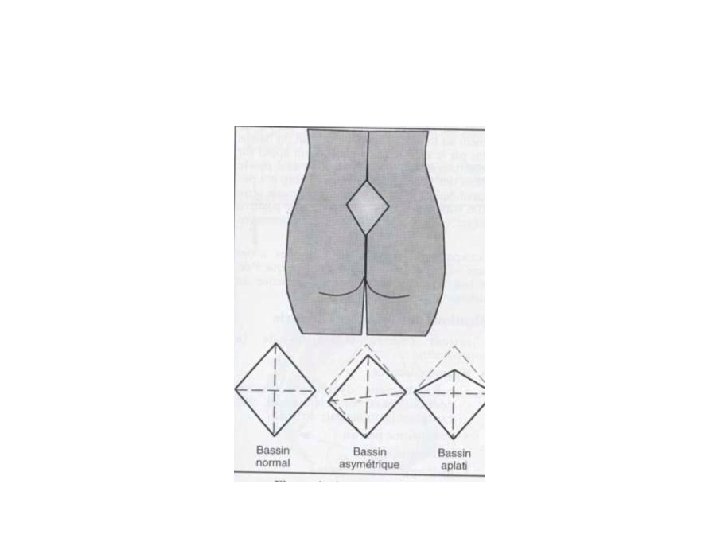 EXPLORATION CLINIQUE DU BASSIN • Pelvimétrie externe : peu utile • Mesure du diamètre pré-pubien de Trillat : c’est la distance joignant au niveau du bord) supérieur du pubis les plis inguinaux (12 -13 cm) • Losange de Michaelis : il est formé par le sommet du pli fessier, l’apophyse épineuse de L 5 et les fossettes cutanées en regard des épines postéro supérieures. Ses dimensions sont pour la diagonale transverse 10 cm et pour le vertical 11 cm • Mensuration du diamètre bi-ischiatique • a- selon Tarnier : c’est la plus utilisé ; sur la femme en position gynécologique, mettre un ruban maintenu par les deux pouces plaqués contre la face interne des ischions tandis qu’un aide mesure la distance qui les sépare, on ajoute l’épaisseur des parties molles(10à 11 cm). • b- Selon GREENHILL: en mettant au contact du périnée un poing serré