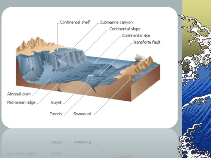 Basins ©Abyssal plains ©Seamount ©Guyot ©Trenches ©Mid Ocean ridges ©Rift Valley