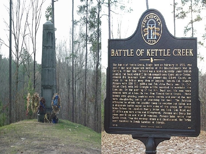 Battle of Kettle Creek • • When? Battle took place on February 14, 1779 Where? outside of Washington, Georgia Who wins? Georgia (patriot)/US victory Other details: – Battle is led by Colonel Elijah Clarke – The Patriots defeated a force of more than 800 British troops – Minor battle when compared to other battles of the Revolution – It was important because the militia was able to take weapons and horses from the British soldiers, and this lifted the spirits of the Georgia militia