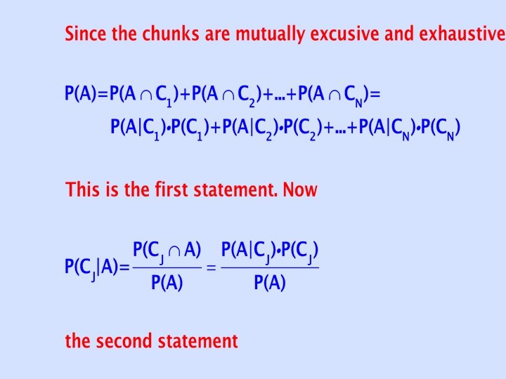 In most applications the verbiage may be complex and confusing. My advice is: First determine what, and how many, the chunks are. Then determine the event A Finally, compute the “givens” and apply theorem. We’ll do some examples at the blackboard.