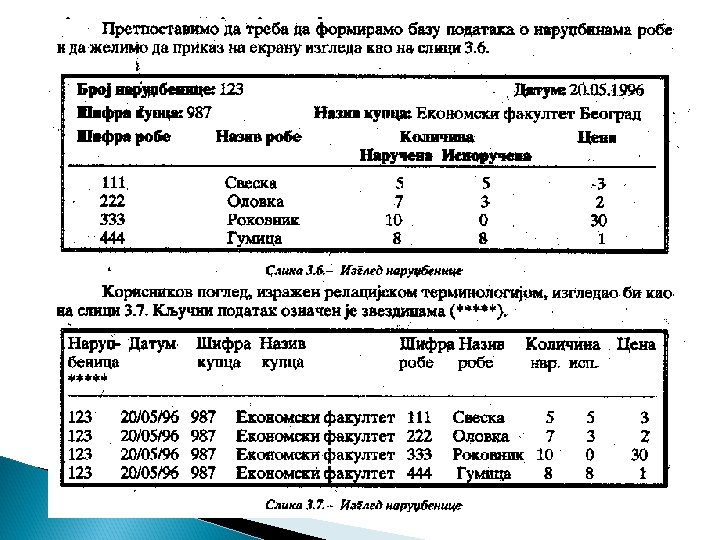 3. 3. RELACIONE BAZE PODATAKA U slučaju složenih veza izme|u podataka, predstavljanje mrežnom ili hijerarhijskom strukturom postaje znatno otežano. Sve veze koje se prikazuju hijerarhijskom ili mrežnom strukturom mogu se prikazati i tabelama. Tabele imaju sledeće osobine: 1. Ne postoje grupe koje se ponavljaju i svaka rubrika tabele predstavlja jedan podatak. 2. U jednoj koloni postoji samo jedna vrsta podataka. 3. Redovi se razlikuju me|u sobom, 4. Kolone imaju svoj naziv.
