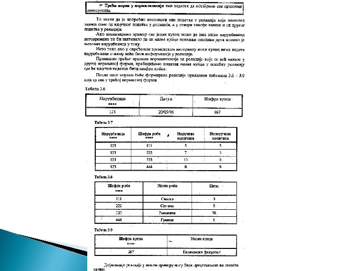 Prvo treba utvrditi zavisnost izmedju polja u tabeli, odnosno da ustanovimo koja polja su zavisna od kojih polja. Ako možemo da odredimo vrednost nekog polja na osnovu vrednosti nekog drugog polja, onda za takvo polje kažemo da je zavisno od onog drugog polja. Kreiramo sledeće tabele: Maturanti ( id_broj, prezime, adresa, odeljenje) Predmet (predmet, ispitivač) Ocene (id_broj, predmet, ocena)