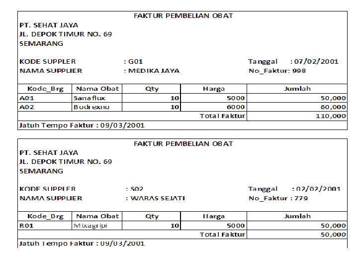 Relasi Supplier Relasi Barang Kode_Supp Nama_Supp Kode_Brg Nama_Brg Harga S 02 Waras Sejati R 01 Mixagripi 5000 G 01 Medika jaya A 01 Sanaflux 5000 A 02 Bodrexno 6000 Relasi Faktur No_Faktur Tanggal Jatuh Tempo Kode_Supp 779 02/02/2001 09/03/2001 S 02 998 07/02/2001 09/03/2001 G 01 Relasi Transaksi No_Faktur Kode_Brg Qty 779 R 01 10 998 A 02 10