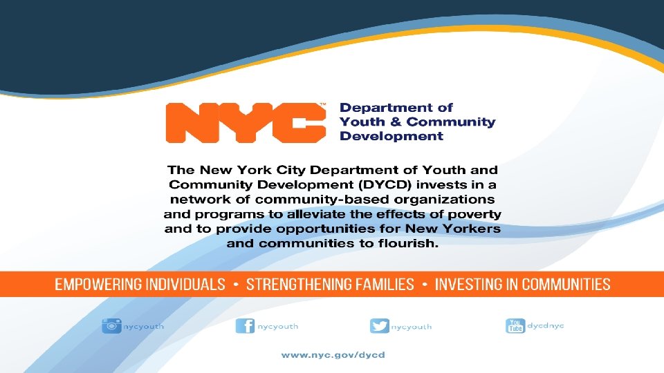 RFP Timeline/Requirements • Award Announcement: Summer of 2017 • Anticipated Contract Term: September 1, 2017 – June 30, 2020 (with an option to renew for up to three additional years) • Questions: Must be received by May 24, 2017 RFPquestions@dycd. nyc. gov