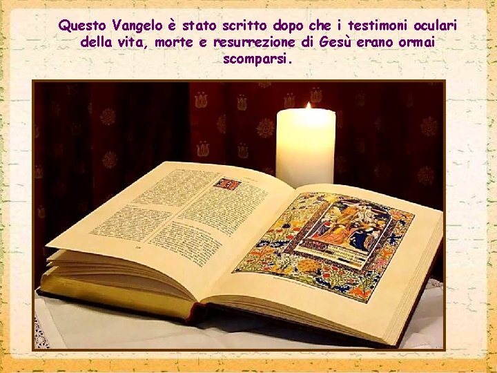 Questo Vangelo è stato scritto dopo che i testimoni oculari della vita, morte e resurrezione di Gesù erano ormai scomparsi.