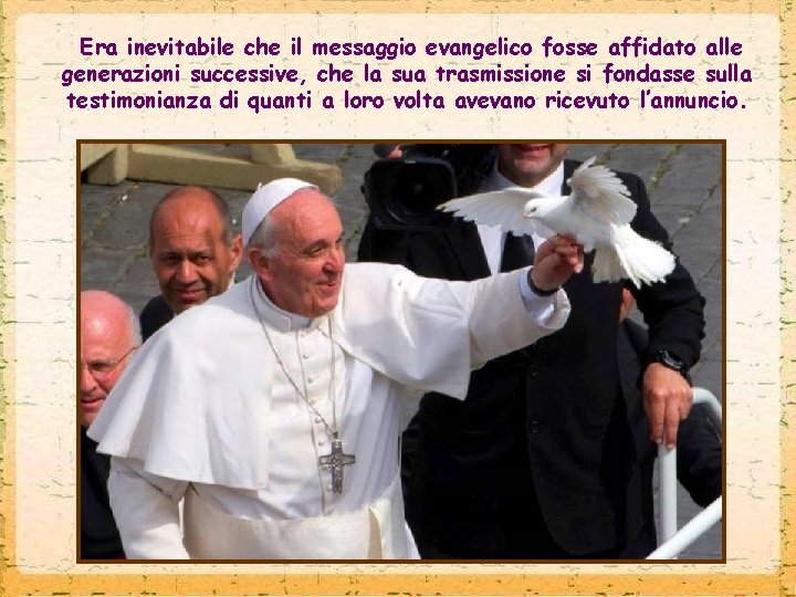 Era inevitabile che il messaggio evangelico fosse affidato alle generazioni successive, che la sua trasmissione si fondasse sulla testimonianza di quanti a loro volta avevano ricevuto l’annuncio.