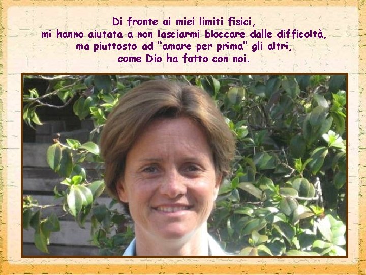 Di fronte ai miei limiti fisici, mi hanno aiutata a non lasciarmi bloccare dalle difficoltà, ma piuttosto ad “amare per prima” gli altri, come Dio ha fatto con noi.