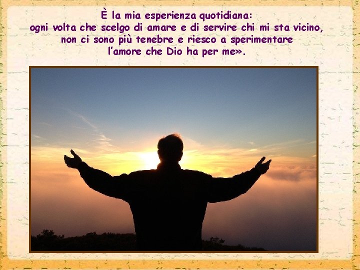 È la mia esperienza quotidiana: ogni volta che scelgo di amare e di servire chi mi sta vicino, non ci sono più tenebre e riesco a sperimentare l’amore che Dio ha per me» .