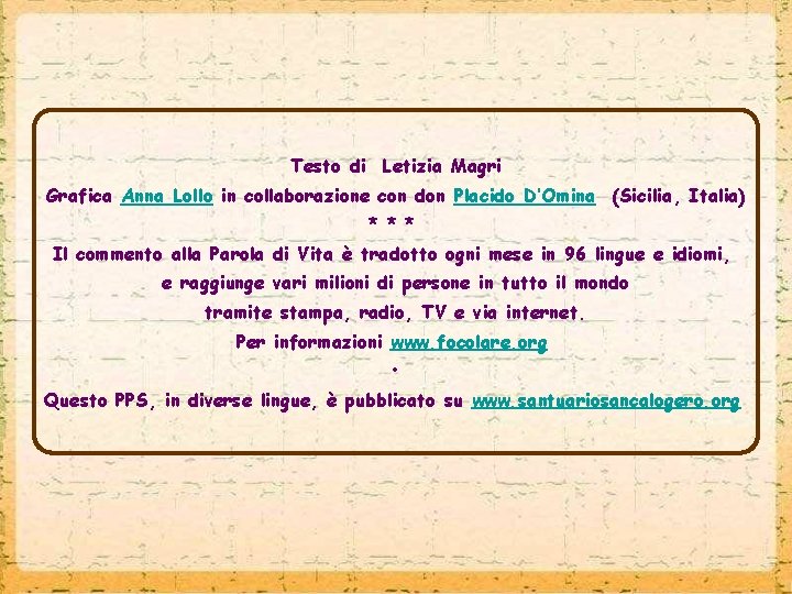 Testo di Letizia Magri Grafica Anna Lollo in collaborazione con don Placido D’Omina (Sicilia, Italia) * * * Il commento alla Parola di Vita è tradotto ogni mese in 96 lingue e idiomi, e raggiunge vari milioni di persone in tutto il mondo tramite stampa, radio, TV e via internet. Per informazioni www. focolare. org • Questo PPS, in diverse lingue, è pubblicato su www. santuariosancalogero. org