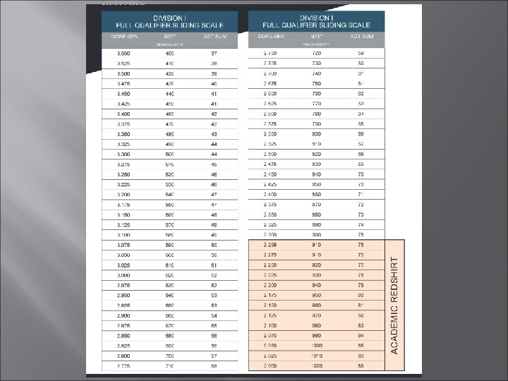 Eligibility - Division I Academic Redshirt Requirments Graduate from High School 16 Core Courses No grades/credits locked in Earn minimum required 2. 0 GPA in core course Meet sliding scale requirements Amateurism Certification
