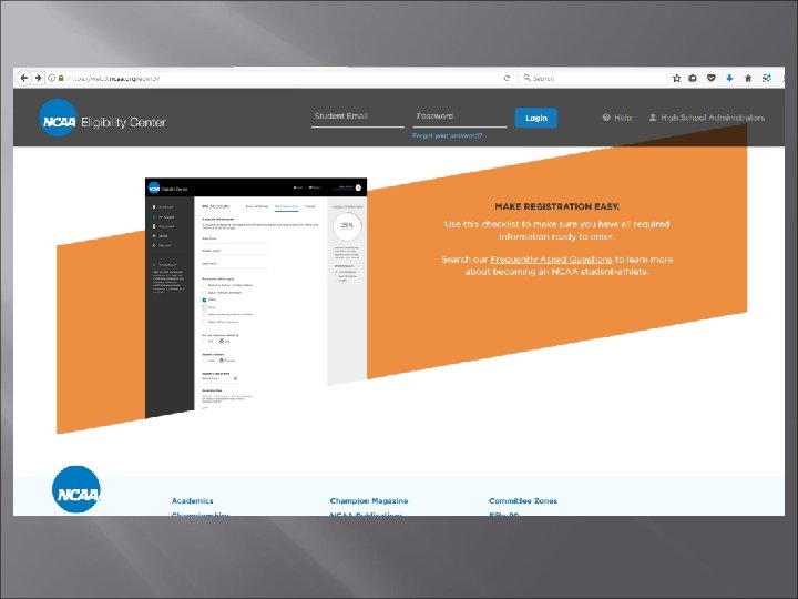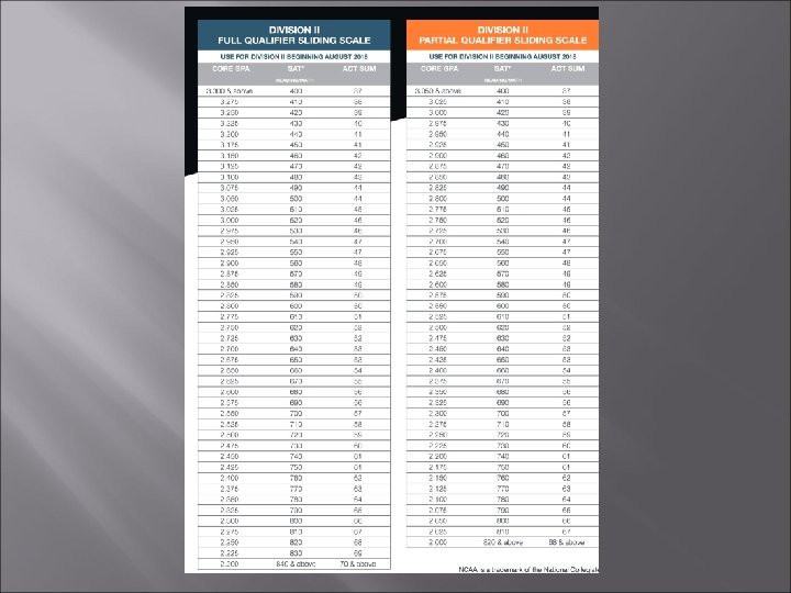 Eligibility - Division I 16 Core Courses Cont. 10 of the 16 to be completed before 7 th semester (senior year) 7 of those 10 MUST BE in English, Math or Natural/Physical Science SAT: Critical Reading & Math Courses are “Locked In” only ACT: English, Math, Reading 2. 3 GPA &in. Science core Earn minimum required course Meet sliding scale requirements: SAT/ACT Amateurism Certification