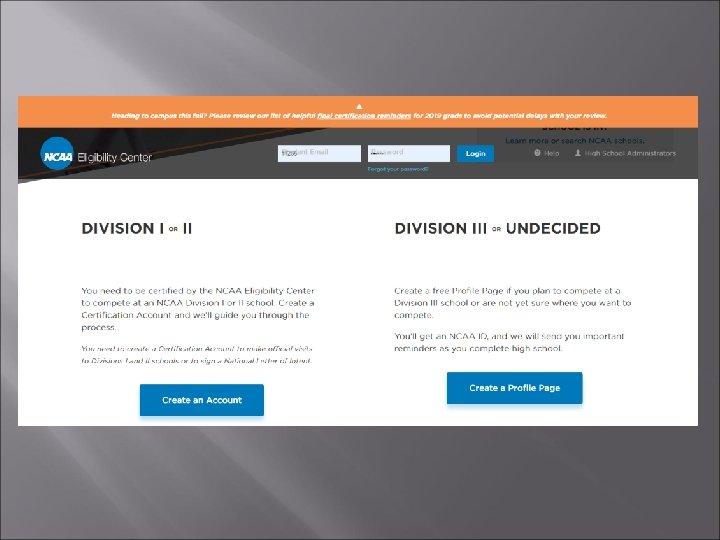 Eligibility NJCAA HS Diploma/GED Not viewed as a professional Division III NOT certified by the NCAA Eligibility Center Institutional admissions standards Division I & II Need to be certified by NCAA Eligibility Center Amateurism Certification