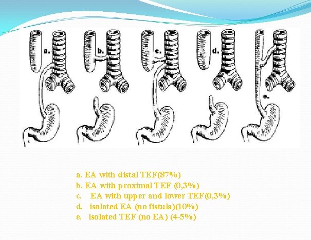 a. EA with distal TEF(87%) b. EA with proximal TEF (0, 3%) c. EA with upper and lower TEF(0, 3%) d. isolated EA (no fistula)(10%) e. isolated TEF (no EA) (4 -5%)