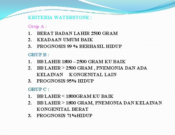 KRITERIA WATERSTONE : Grup A : 1. BERAT BADAN LAHIR 2500 GRAM 2. KEADAAN UMUM BAIK 3. PROGNOSIS 99 % BERHASIL HIDUP GRUP B : 1. BB LAHIR 1800 – 2500 GRAM KU BAIK 2. BB LAHIR > 2500 GRAM , PNEMONIA DAN ADA KELAINAN KONGENITAL LAIN 3. PROGNOSIS 95% HIDUP GRUP C : 1. BB LAHIR < 1800 GRAM KU BAIK 2. BB LAHIR > 1800 GRAM, PNEMONIA DAN KELAINAN KONGENITAL BERAT 3. PROGNOSIS 71%HIDUP