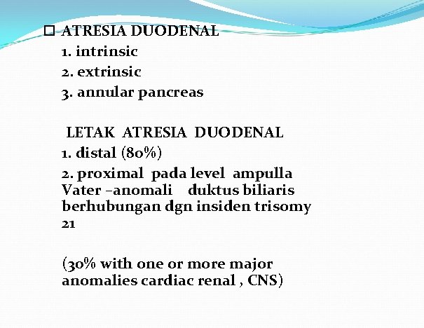 ATRESIA DUODENAL 1. intrinsic 2. extrinsic 3. annular pancreas LETAK ATRESIA DUODENAL 1. distal (80%) 2. proximal pada level ampulla Vater –anomali duktus biliaris berhubungan dgn insiden trisomy 21 (30% with one or more major anomalies cardiac renal , CNS)