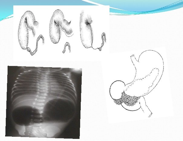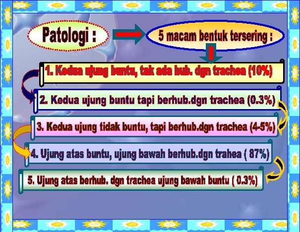 1. Pipa lambung berbelok 2. Ada fistel trachea ==> udara dlm usus +
