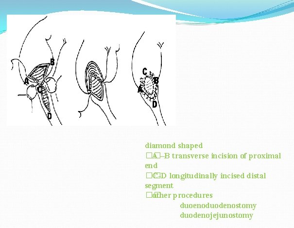 diamond shaped �� A –B transverse incision of proximal end �� C-D longitudinally incised distal segment �� other procedures duoenoduodenostomy duodenojejunostomy