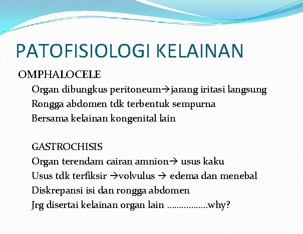 PATOFISIOLOGI KELAINAN OMPHALOCELE Organ dibungkus peritoneum jarang iritasi langsung Rongga abdomen tdk terbentuk sempurna Bersama kelainan kongenital lain GASTROCHISIS Organ terendam cairan amnion usus kaku Usus tdk terfiksir volvulus edema dan menebal Diskrepansi isi dan rongga abdomen Jrg disertai kelainan organ lain ……………. . why?