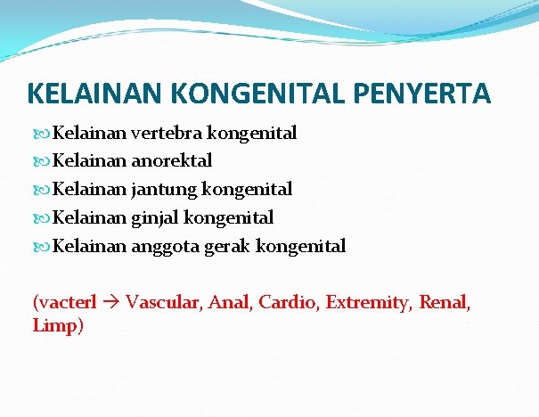 KELAINAN KONGENITAL PENYERTA Kelainan vertebra kongenital Kelainan anorektal Kelainan jantung kongenital Kelainan ginjal kongenital Kelainan anggota gerak kongenital (vacterl Vascular, Anal, Cardio, Extremity, Renal, Limp)