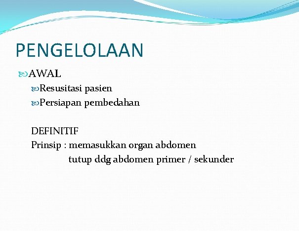 PENGELOLAAN AWAL Resusitasi pasien Persiapan pembedahan DEFINITIF Prinsip : memasukkan organ abdomen tutup ddg abdomen primer / sekunder