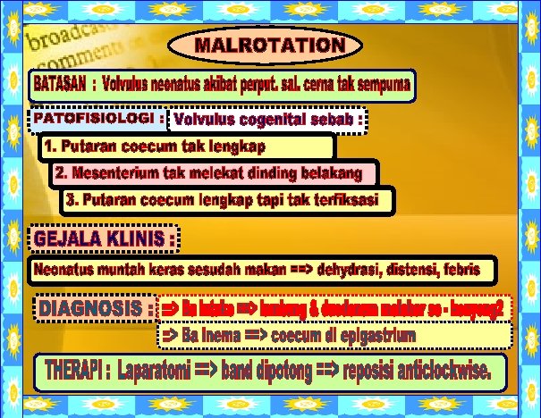 MALROTASI SALURAN PENCERNAAN : A. Gambaran umum : 1. Diagnosis sulit ditegakkan 2. Gejala awal tampak sebagai tanda obstruksi 3. Setiap obstruksi usus setinggi duodenum dapat dicurigai sebagai adanya malrotasi usus 4. Obstruksi usus tinggi parsial selalu disebabkan oleh malrotasi 5. Malrotasi berbahaya dan menjadi emergensi jika mengalami volvulus