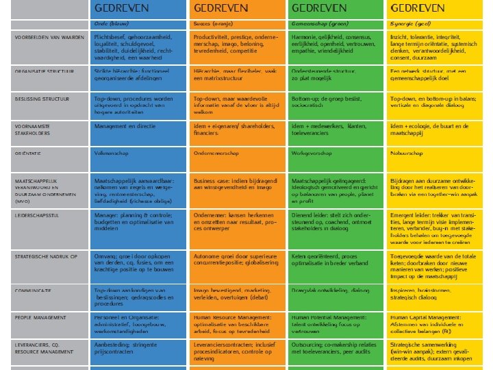G. Sanders en B. Neuijen • Procesgericht - Taakgericht • Mensgericht - Werkgericht • Organisatiegebonden - Professioneel • Open - Gesloten • Strakke controle - Losse controle • Pragmatisch (resultaat) – Normatief(regels)