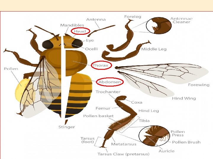 3. Hind legs - Legs farthest from the head In workers, these legs have a unique set of tools used to collect and carry pollen called the press, brush, and auricle.