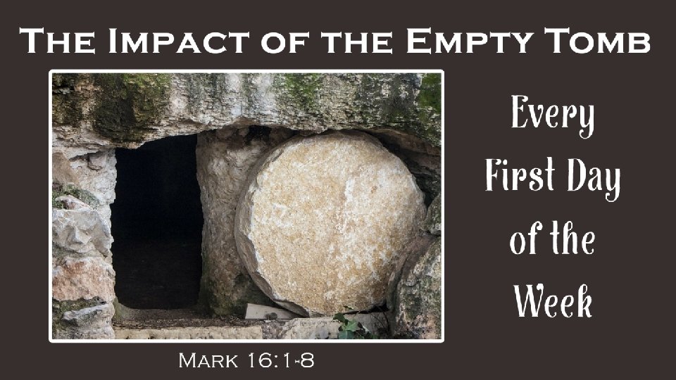 • When Jairus’ daughter was raised: − “they were overcome with great amazement” (Mark 5: 42) • When the widow of Nain’s son was raised: − “fear seized them all” (Luke 7: 16) • When Jesus was raised: − They went from the tomb with “fear and great joy” (Matt. 28: 8 -9) − “trembling and astonishment had seized/gripped them” (Mark 16: 8) − “Peter departed, marveling to himself at what had happened” (Luke 24: 12) • Does the empty tomb create awe and excitement in us/you? − For the first day of the week? − For worshiping God?