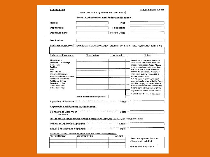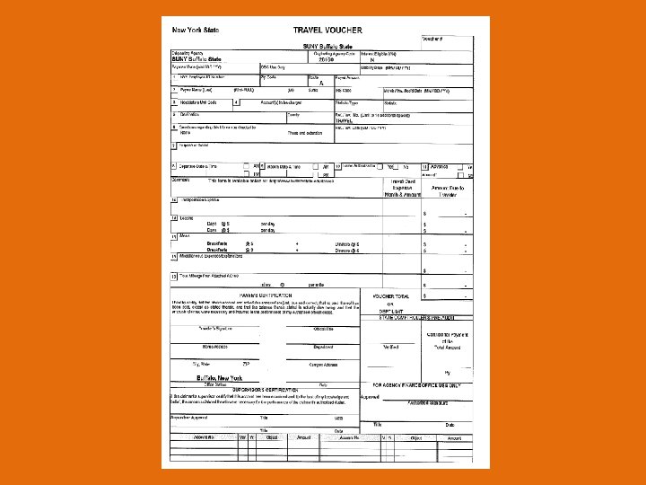 After Travel • A NYS Travel Voucher Form must be completed and approved. • If a personal vehicle was used and the traveler is requesting mileage reimbursement, a NYS Statement of Automobile Travel Form must accompany the NYS Travel Voucher. • All receipts must establish proof of payment. • Travelers must be certain all signatures and funding are included on the Travel Voucher. • There is no such thing as “too much back-up”.