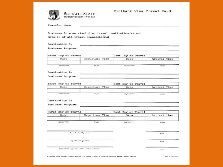 • Travelers must be certain their authorization has the appropriate signatures. • Out-of-state travel requires a supervisor’s signature in addition to that of a Dean or VP. Travel within NYS requires the traveler’s supervisor’s signature. • When forms are incomplete or instructions are not followed completely, requests may not be able to be filled in a timely manner.