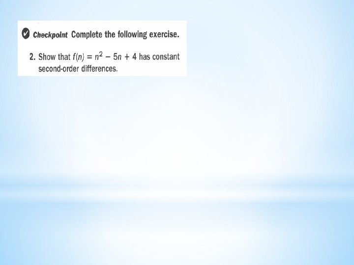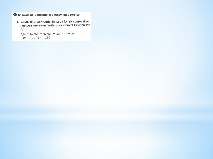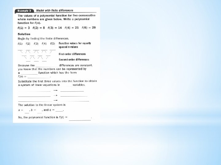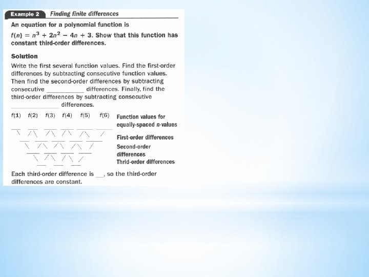 Finite Difference: When the x-values in a data set are equally spaced, the _____________________________________________________________ Properties of Finite Differences • If a polynomial function f(x) has degree n, then the nth-order differences of function values for equally-spaced x-values ___________________ • If the nth-order differences of equally spaced data are nonzero and constant, then the data can be represented by a polynomial function of ____________