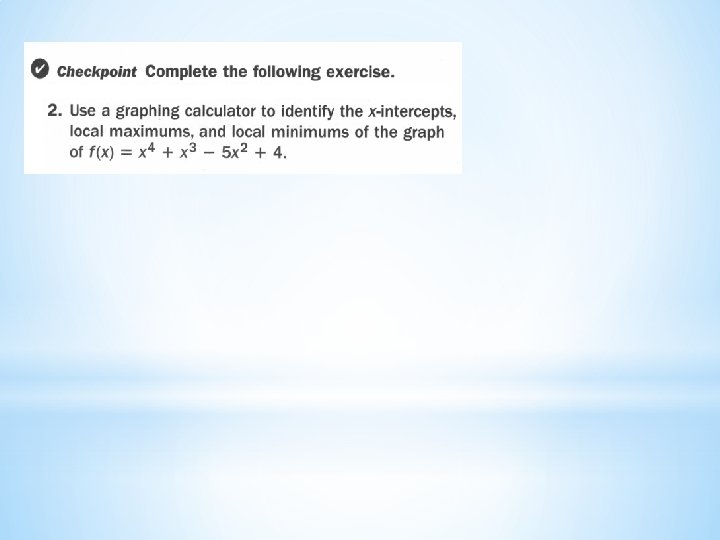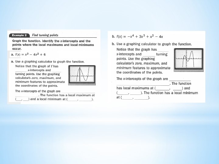 * * Turning * * The graph of every polynomial function of degree n, has at most _____ turning points. If a polynomial function has n distinct real zeros, then its graph has exactly ______ turning points. * * * Points: Correspond to _______________________________ Local Maximum: The ___________ of a turning point, if the point is higher than all nearby points. Local Minimum: The ___________ of a turning point, if the point is lower than all nearby points. Zero of the Function: The _________________