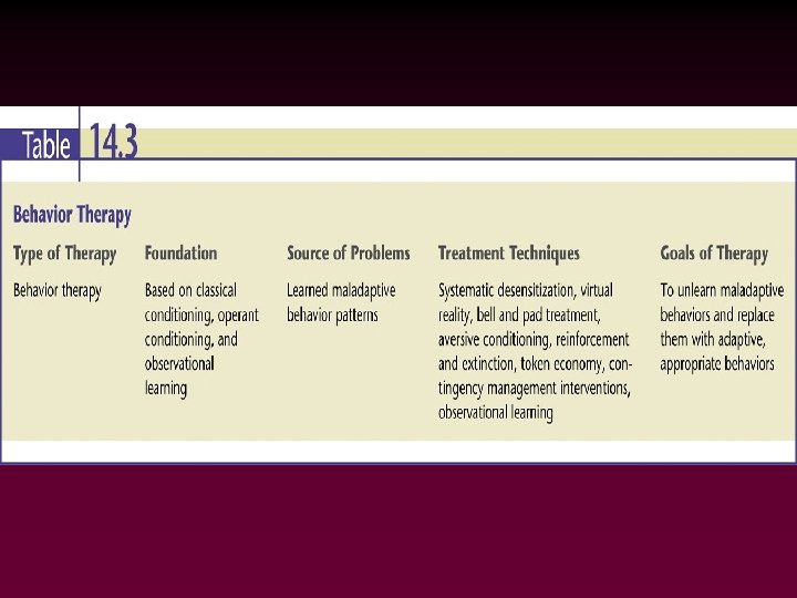 Behavior Therapy • Behavioristic perspective emphasizes that behavior (normal and abnormal) is learned – Not concerned about self-awareness • Applies classical and operant conditioning to the elimination of unwanted behaviors – Primary concern is to eliminate the disorder’s behavior, not find the cause of the disorder • Often called behavior modification