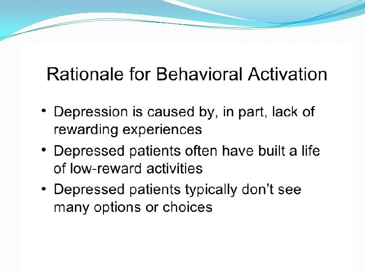 Introducing your Pt to BA �Orient to treatment rationale and approach �Develop initial treatment goals �Behavioral analyses (**think cause and effect**) �Repeated application of activation while promoting engagement strategies �Between you and the client (Modeling) �Between the client and others �Ongoing troubleshooting �Treatment review and relapse prevention