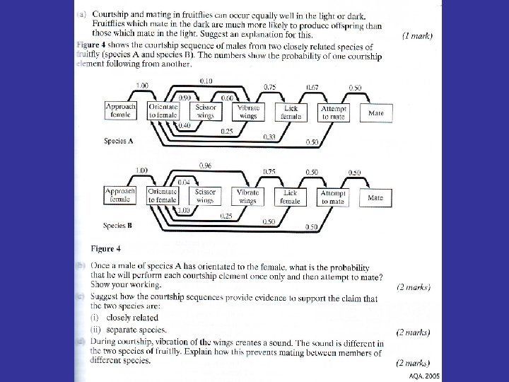 Closely related species show subtle differences in courtship • Individuals of the same species show the same courtship. • How many different species are shown here? Answer 5 not 6