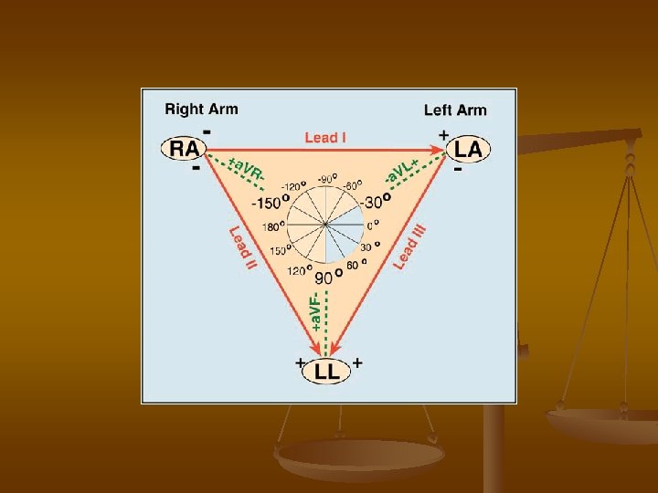 Axis in the left axis deviation (LAD) range n n Lead a. VR is the smallest and isoelectric lead The two perpendiculars are 60 o and +120 o Leads II and III are mostly negative (i. e. , moving away from the + left leg) The axis, therefore, is -60 o