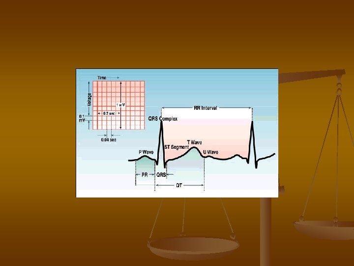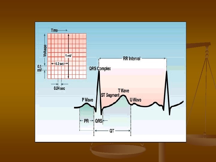 n n n 1. 2. 3. 4. 5. PR Interval: 0. 12 - 0. 20 sec QRS Duration: 0. 06 - 0. 10 sec QT Interval (QTc < 0. 40 sec) Bazett's Formula: QTc = (QT)/Sq. Root RR (in seconds) Poor Man's Guide to upper limits of QT: For HR = 70 bpm, QT<0. 40 sec; for every 10 bpm increase above 70 subtract 0. 02 sec, and for every 10 bpm decrease below 70 add 0. 02 sec. For example QT < 0. 38 @ 80 bpm QT < 0. 42 @ 60 bpm Frontal Plane QRS Axis: +90 o to -30 o (in the adult)
