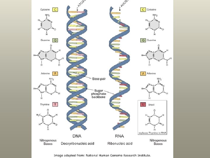 DNA vs RNA Structure Deoxyribose DNA ◦ Is missing one oxygen in the ribose sugar. Ribose ◦ Nucleic Acid = RNA Has all oxygens