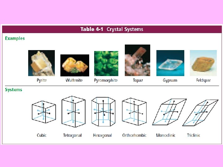 Minerals • Rock-forming minerals are made of these 8 common elements • 1. Oxygen • 2. Silicon • 3. Aluminum • 4. Iron • 5. Calcium • 6. Sodium • 7. Magnesium • 8. Potassium
