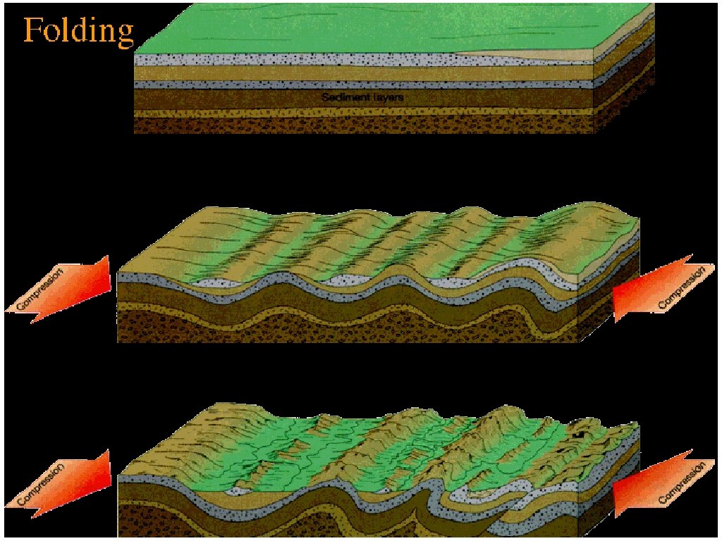 Changing Earth’s Surface • Stresses in Earth’s crust cause the surface to change. Different stresses cause different changes. • Compression causes folding. Folding is the bending of rock without breaking. Folding is like a rug getting wrinkled up when it is pushed across the floor.