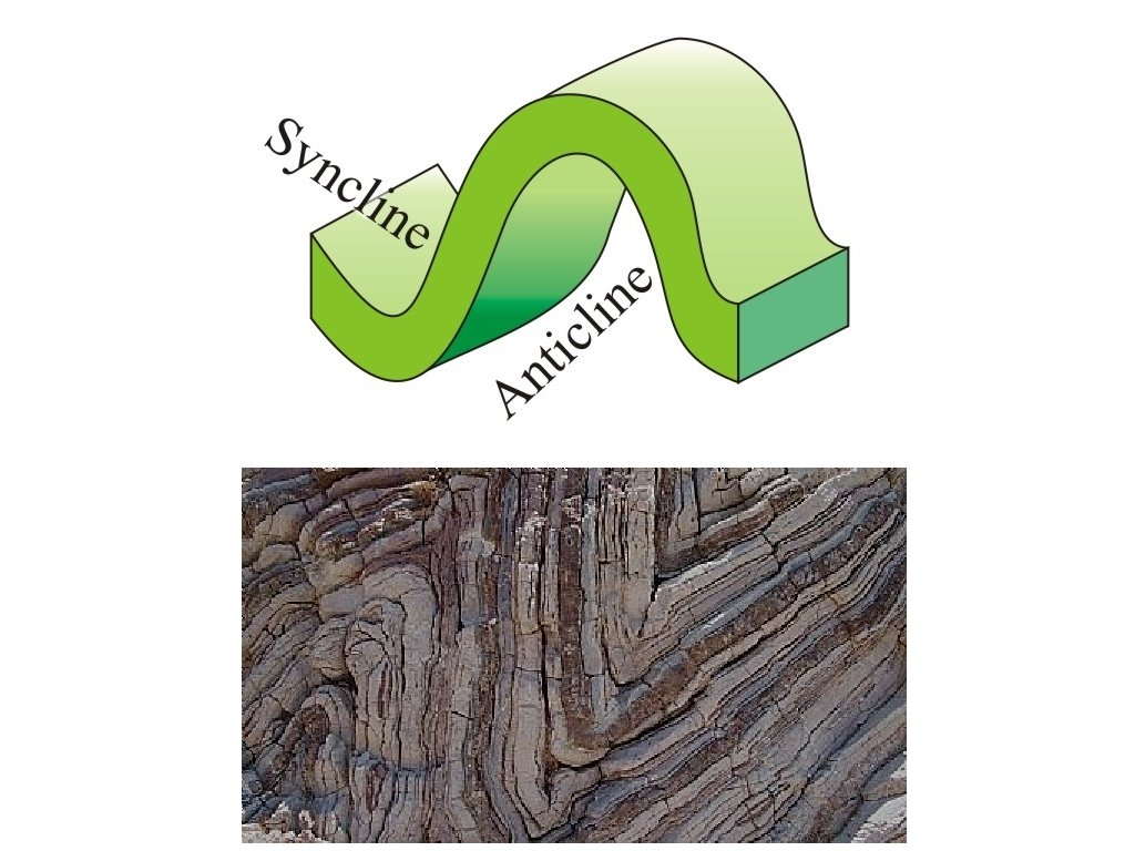 Changing Earth’s Surface • Folds that bend upward into ridges are called anticlines. Folds that bend downward into valleys are called synclines. • Anticlines = think how “A” points upward. • Synclines = “sync” or “sink” down. • The central Appalachian mountains, the Himalayas, and the Alps are all folded rocks.